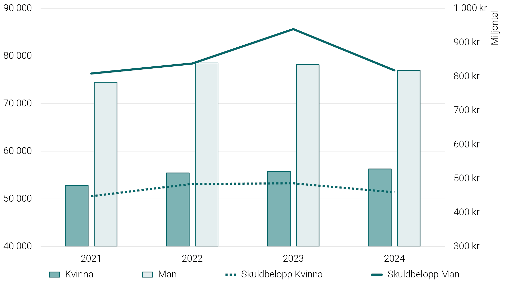 Däremot har det yrkade beloppet inte ökat i samma utsträckning som antalet inkomna mål. Beloppet har ökat med knappt 21 miljoner kronor, vilket motsvarar en ökning på 1,7 procent från 2021 till och med 2024. Ökningen av det totala yrkade beloppet är större för kvinnor (2,6 procent) än för män (1,1 procent). Unga män har dock alltjämt större skulder. De står för 64 procent av det totala beloppet. Vid slutet av 2024 hade unga män krav riktade mot sig på knappt 820 miljoner kronor och unga kvinnor har krav riktade mot sig på knappt 460 miljoner kronor.