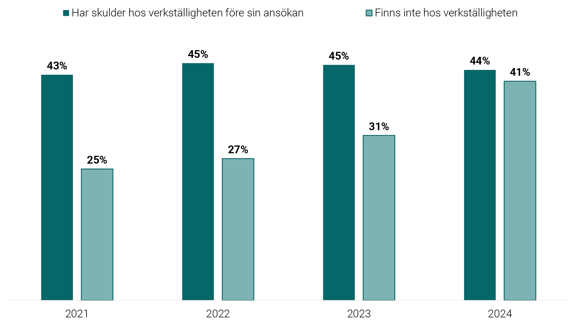 Figur 6 Andel personer som har skulder för verkställighet hos Kronofogden före de nya kraven, 2021–2024