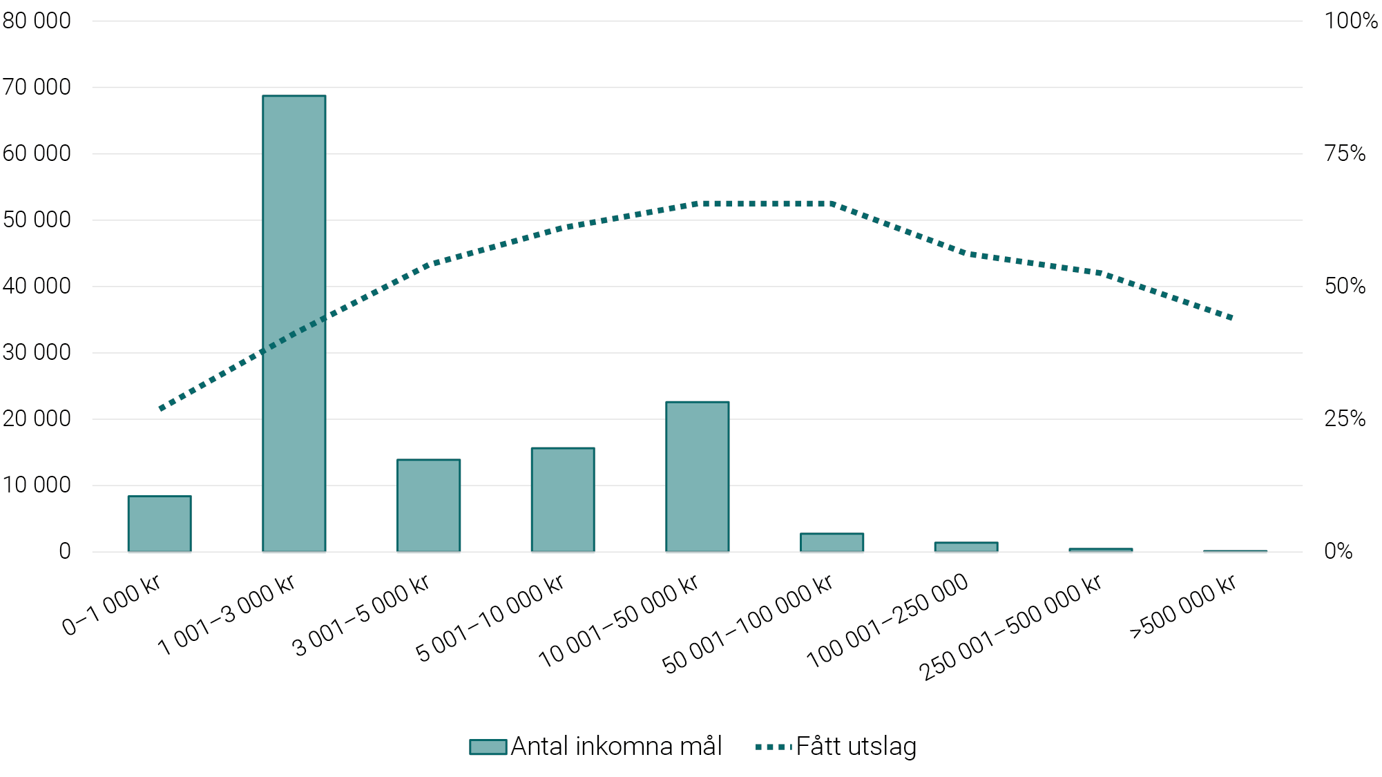 Ungefär 53 procent av alla inkomna mål om betalningsbetalningsföreläggande under 2021-2024 hade ett yrkat belopp på mellan 1 001–3 000 kronor. Sannolikheten för att ett krav fastställs genom ett utslag är högre för de mål som har ett större yrkat belopp, men bara upp till en viss gräns. Mer än hälften av alla inkomna mål med ett yrkat belopp mellan 3 001och 500 000 kronor har lett till ett utslag. Andelen mål som har lett till utslag minskar för mål med ett belopp över 100 000 kronor. Ungefär 44 procent av inkomna mål med ett belopp över 500 000 kronor har lett till ett utslag. Detta kan bero på att mål med belopp över 500 000 kronor oftast avser lån med säkerhet, t.ex. bolån eller billån, samt att dessa svaranden kan ha större marginaler i sin ekonomi och därmed större möjlighet att betala sina skulder efter att ett krav har riktats mot dem.
