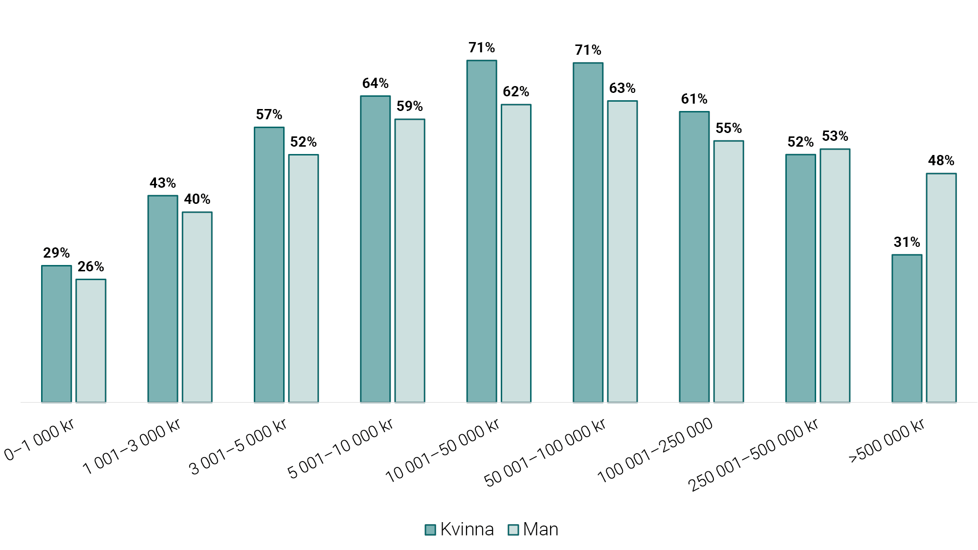 När det gäller mål på upp till 250 000 kronor, är det en större andel mål som får utslag som gäller unga kvinnor . För mål på över 250 000 är det tvärtom – här är det en större andel som får utslag som rör unga män (Figur 9).