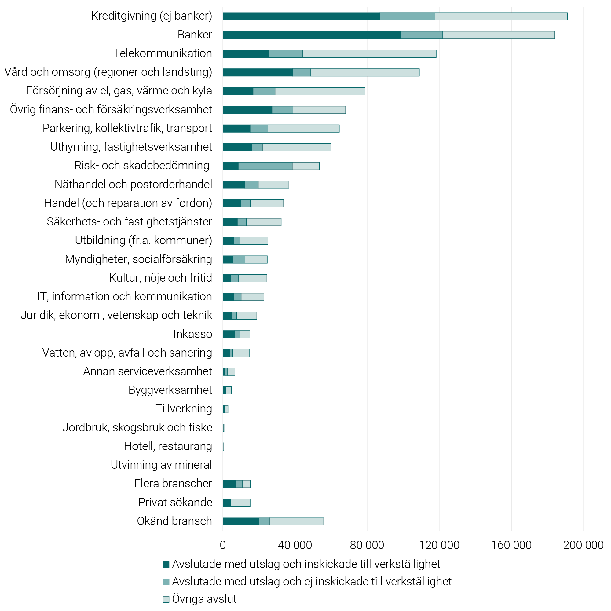 Inom inkassobranschen, där fordringarna oftast består av lån och krediter, får 63 procent av målen utslag, och 44 procent leder vidare till verkställighet. Övrig finans- och försäkringsverksamhet, exempelvis leasingbolag och factoringföretag, visar en något lägre men fortfarande betydande sannolikhet för båda utfallen. Näthandel och postorderhandel är den enda konsumentnära branschen i denna toppgrupp. Även här får 54 procent av målen utslag och 33 procent går till verkställighet.