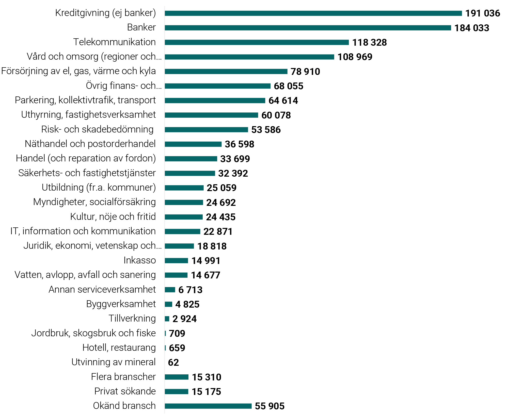 Två branscher dominerar tydligt vad gäller antalet krav (ansökan om betalningsföreläggande): kreditgivning, exempelvis snabblån och konsumentkrediter utanför det traditionella banksystemet, samt banker, framför allt nischbanker och internationella kreditinstitut. Tillsammans står dessa två branscher för över 29 procent av alla mål, vilket motsvarar över 375 000 ärenden. Kraven från dessa branscher handlar ofta om obetalda lån, krediter eller kontokortsfordringar.